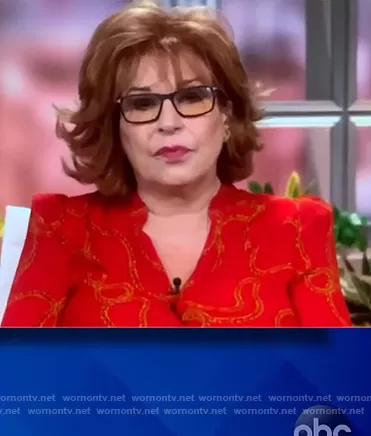 Joy Behar on The View on ABC was spotted wearing this red chain print blouse on The View on May 25 2021's episode. Joy's Top is the Florent Long Sleeve Chain Print Silk Blouse by L'Agence.