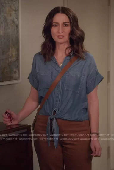 Dawn Solano (played by Sara Bareilles) on Girls5eva on Peacock was spotted wearing this chambray tie front shirt on Girls5eva on episode 'A.I.R.P.I.G.' (1x07) in May 2021. Dawn's Top is the Tie-Front Chambray Shirt by Bella Dahl.