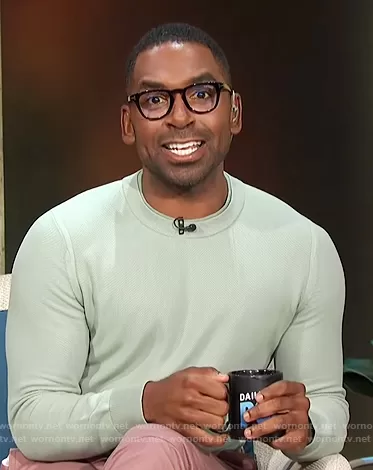 Justin Sylvester on E! News on E! was spotted wearing this green crew neck sweater on E! News Daily Pop on Aug 25 2021's episode. Justin's Sweater is the Riland Pique Crew Sweater by Theory.