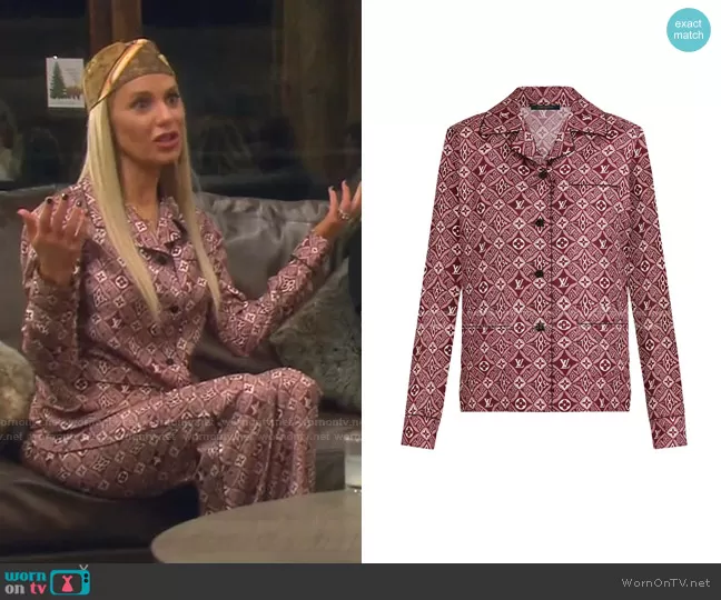 Dorit Kemsley on The Real Housewives of Beverly Hills on Bravo was spotted wearing this burgundy monogram print pajamas on The Real Housewives of Beverly Hills on episode 'Two Truths and a Lie' (11x02) in May 2021. Dorit's Top is the Since 1854 Pajama Top by Louis Vuitton . Dorit's Pants is the Since 1854 Pajama Pants by Louis Vuitton . Dorit's Scarf is the Monogram Silk Scarf by Louis Vuitton.