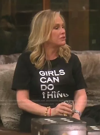 Kathy Hilton on The Real Housewives of Beverly Hills on Bravo was spotted wearing this Girls Can Do Any-thing tee on The Real Housewives of Beverly Hills on episode 'Two Truths and a Lie' (11x02) in May 2021. Kathy's Top is the Bella T-Shirt by Zadig & Voltaire.
