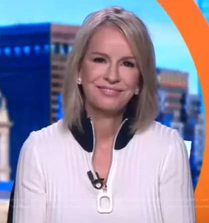 Dr. Jennifer Ashton on Good Morning America on ABC was spotted wearing this white ribbed half-zip sweater on Good Morning America on Feb 25 2022's episode. Jennifer's Sweater is the Infinity Two-Tone Ribbed Merino Wool Sweater by JW Anderson.