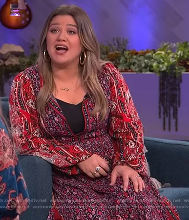 Kelly Clarkson on The Kelly Clarkson Show on NBC was spotted wearing this red printed midi dress on The Kelly Clarkson Show on May 27 2021's episode. Kelly's Dress is the Happy Feelings Midi Dress by Free People.