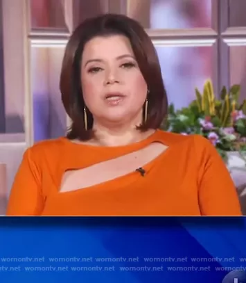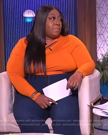 Loni Love on The Real on BETher was spotted wearing this orange cutout top on The Real on Oct 05 2021's episode. Loni's Top is the Long Sleeve Cutout Tee by Eloquii.