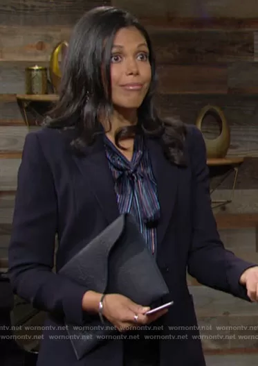 Amanda Sinclair (played by Karla Mosley) on The Young and the Restless on CBS was spotted wearing this purple and blue tie neck blouse on The Young and the Restless on May 28 2021's episode. Amanda's Top is the Malaya Blouse by Veronica Beard.