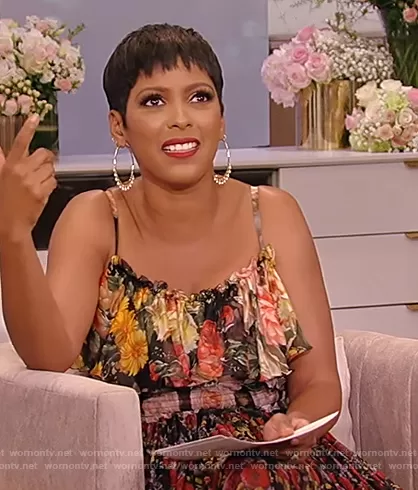 Tamron Hall on Tamron Hall Show on ABC was spotted wearing this black floral ruffle dress on Tamron Hall Show on May 28 2021's episode. Tamron's Dress is the Floral-print tiered silk-chiffon gown by Dolce & Gabbana.