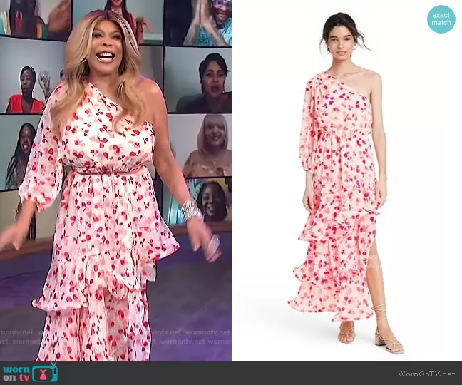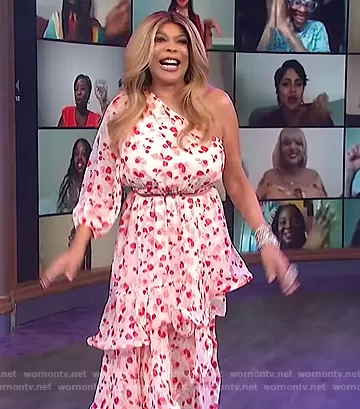 Wendy Williams on The Wendy Williams Show on Various was spotted wearing this pink floral one sleeve dress on The Wendy Williams Show on May 28 2021's episode. Wendy's Dress is the Floral One Shoulder Ruffle Dress by Alexis for Target.