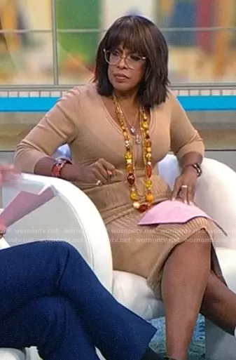 Gayle King on CBS Mornings on CBS was spotted wearing this beige ribbed v-neck dress on CBS Mornings on Nov 30 2022's episode. Gayle's Dress is the V-Neck Sweater Dress - Gabrielle Union Collection by New York & Company .