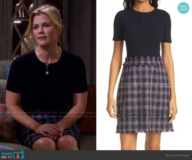 Sami Brady (played by Alison Sweeney) on Days of our Lives on Peacock was spotted wearing this navy top and purple tweed skirt on Days of our Lives on May 29 2021's episode. Sami's Dress is the Rosesan Mixed Media Metallic Dress by Ted Baker.