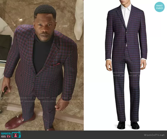 Jeff Colby (played by Sam Adegoke) on Dynasty on The CW was spotted wearing this checked suit on Dynasty on episode 'Everybody Loves the Carringtons' (4x04) in May 2021. Jeff's Jacket is the Check-Print Wool Sport Coat by Etro . Jeff's Pants is the Slim Check Wool Pants by Etro . Jeff's Shoes is the Donnie Double G Loafer by Gucci.