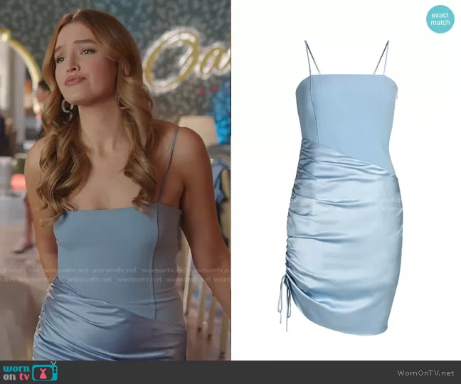 Kirby Anders (played by Maddison Brown) on Dynasty on The CW was spotted wearing this blue mini dress on Dynasty on episode 'Everybody Loves the Carringtons' (4x04) in May 2021. Kirby's Dress is the Juliette Spaghetti Strap Bodycon Dress by Cinq a Sept . Kirby's Shoes is the Freesia Sandals by Gianvito Rossi . Kirby's Coat is the Leather Belted Trench Coat by Victoria Victoria Beckham . Kirby's EArrings is the Crystal & Acetate Triple Hoop Earrings by Lele Sadoughi . Kirby's Bag is the Mini Rainbow Leather Top Handle Bag by By Far . Kirby's is the .