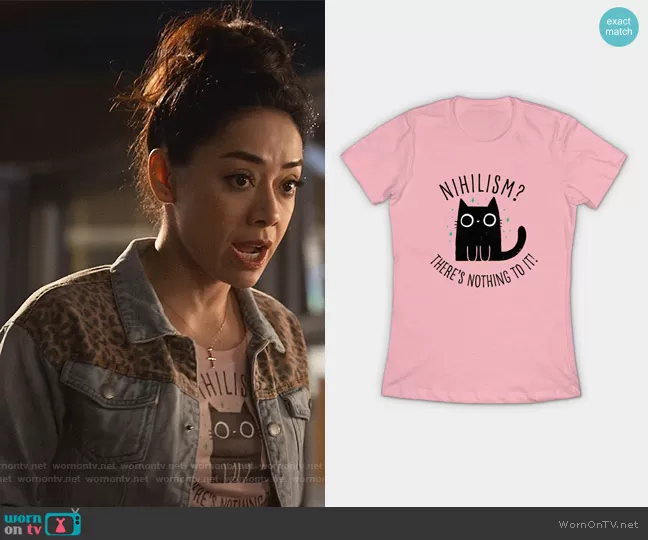 Ella Lopez (played by Aimee Garcia) on Lucifer on Netflix was spotted wearing this pink cat print tee on Lucifer on episode 'Nothing Lasts Forever' (5x14) in Jun 2021. Ella's Top is the Nihilism Cat T-Shirt by by Dinomike from Teepublic.