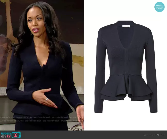 Amanda Sinclair (played by Mishael Morgan) on The Young and the Restless on CBS was spotted wearing this navy peplum jacket on The Young and the Restless on Jun 01 2021's episode. Amanda's Jacket is the Crepe Knit V-neck Ruffle Jacket Navy by Scanlan Theodore . Amanda's Skirt is the Crepe Knit Slit Back Skirt Navy by Scanlan Theodore.