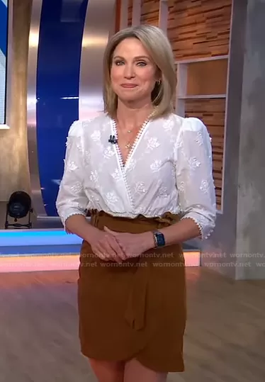 Amy Robach on Good Morning America on ABC was spotted wearing this white floral embroidered top and suede skirt on Good Morning America on Jun 01 2021's episode. Amy's Top is the Floral-embroidered cotton top by The Kooples . Amy's Skirt is the Sun Suede Cross Front Skirt by Ba&Sh.
