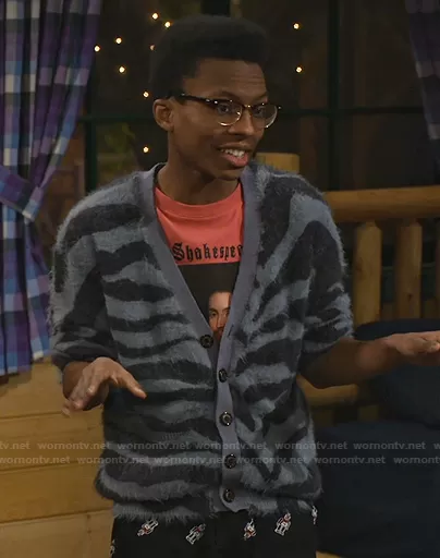 Noah Lambert (played by Israel Johnson) on Bunkd on Disney was spotted wearing this zebra cardigan and robot print pants on Bunkd on episode 'Everyone's Trap'd' (5x09) in Jun 2021. Noah's Sweater is the Fuzzy Tiger Print Cardigan by Urban Outfitters . Noah's Pants is the Patterned Flannel Jogger Pajama Pants by Old Navy.