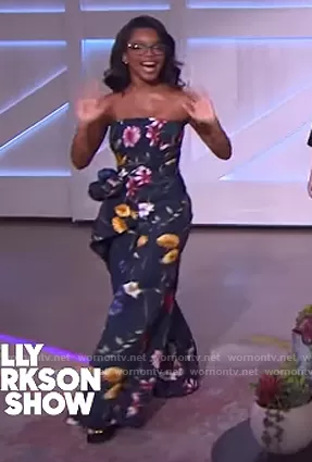 on The Kelly Clarkson Show on NBC was spotted wearing this black floral sleeveless drape top on The Kelly Clarkson Show on Jun 02 2021's episode. 's Top is the Floral Strapless Cascade Corset Top by Oscar de la Renta . 's Pants is the Floral High Waisted Wide-Leg Pants by Oscar de la Renta.