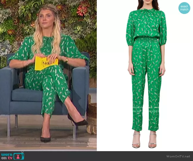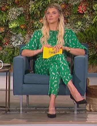 Amanda Kloots on The Talk on CBS was spotted wearing this green floral print jumpsuit on The Talk on Jun 02 2021's episode. Amanda's Jumpsuit is the Floral Elbow-Sleeve Woven Jumpsuit by Maje.