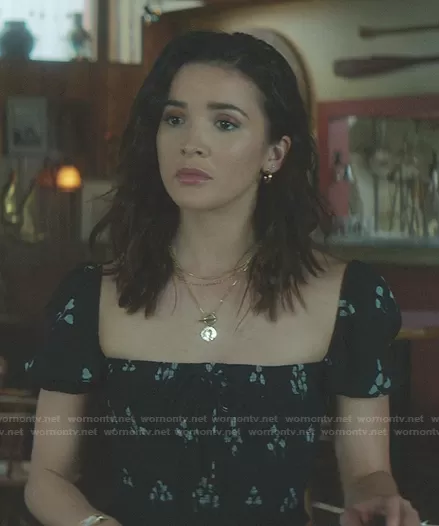 Bess (played by Maddison Jaizani) on Nancy Drew on The CW was spotted wearing this black floral smocked top on Nancy Drew on episode 'The Echo of Lost Tears' (2x18) in Jun 2021. Bess's Top is the Smocked Blouse by Wilfred.
