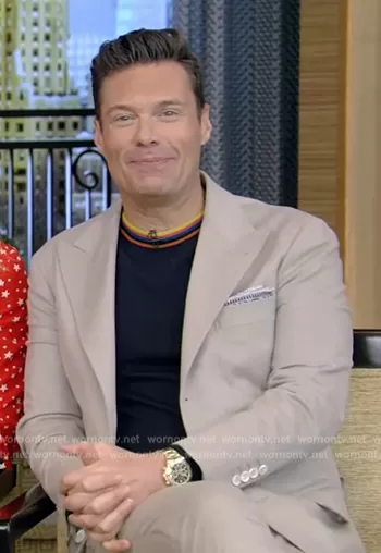 on Live with Kelly and Mark on Disney ABC Home Entertainment was spotted wearing this striped neck sweater on Live with Kelly and Ryan on Mar 08 2023's episode. 's Sweater is the Merino Wool Sweater With Artist Stripe Ribbed Collar by Paul Smith.