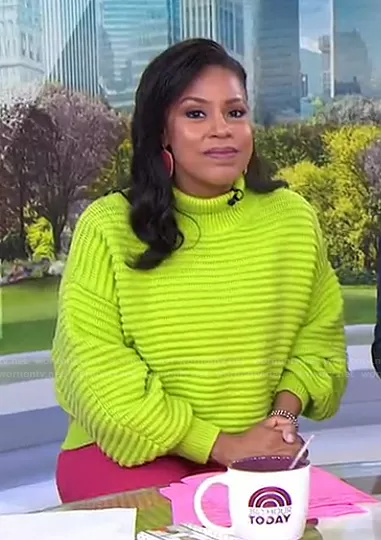 Sheinelle Jones on Today on NBC was spotted wearing this yellow ribbed sweater on Today on Jun 15 2021's episode. Sheinelle's Sweater is the Liliana Knit Sweater by Tanya Taylor . Sheinelle's Earrings is the Elle Drop Earrings in Berry Illusion by Kendra Scott.