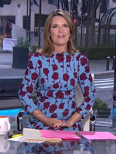 Savannah Guthrie on Today on NBC was spotted wearing this blue rose print dress on Today on Jun 04 2021's episode. Savannah's Dress is the Double Face Rose Printed Crepe Long Sleeve Midi Dress by Lela Rose.