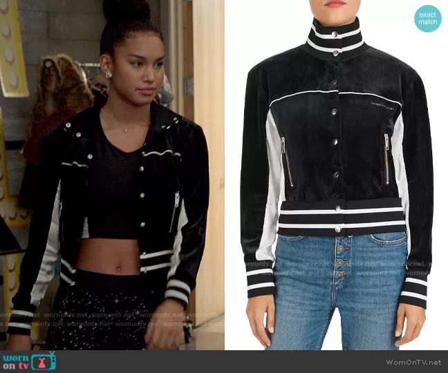 Gina (played by Sofia Wylie) on High School Musical The Musical The Series on Disney was spotted wearing this black track jacket on High School Musical The Musical The Series on episode 'The Storm' (2x04) in Jun 2021. Gina's Jacket is the Logo-Detail Track Jacket by The Kooples x Sport . Gina's Pants is the Pro Starry Night Metallic Print Training Tights by Nike .