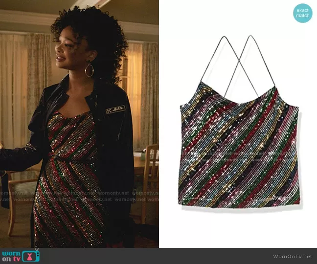 Monica Colby (played by Wakeema Hollis) on Dynasty on The CW was spotted wearing this rainbow striped sequin cami and skirt on Dynasty on episode 'New Hopes, New Beginnings' (4x05) in Jun 2021. Monica's Top is the Gia Cowel Neck Cami by Milly . Monica's Skirt is the Rainbow Multistripe Sequin Bias Skirt by Milly . Monica's Coat is the Long Belted Trench Coat by Off-White.