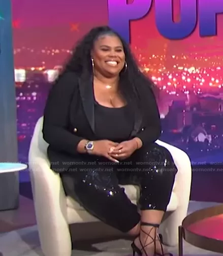 Nina Parker on E! News on E! was spotted wearing this black sequin pants on E! News Nightly Pop on Jun 08 2021's episode. Nina's Pants is the Trendy Plus Size Sequin Joggers by Nina Parker.