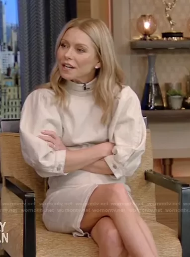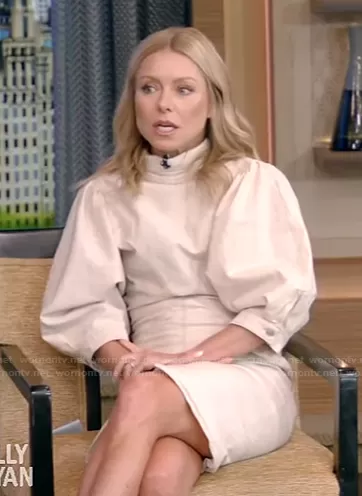Kelly Ripa on Live with Kelly and Mark on Disney ABC Home Entertainment was spotted wearing this ivory puff sleeve mini dress on Live with Kelly and Ryan on Dec 30 2021's episode. Kelly's Dress is the Laure Puff-Sleeve Denim Midi Dress by Isabel Marant Etoile.