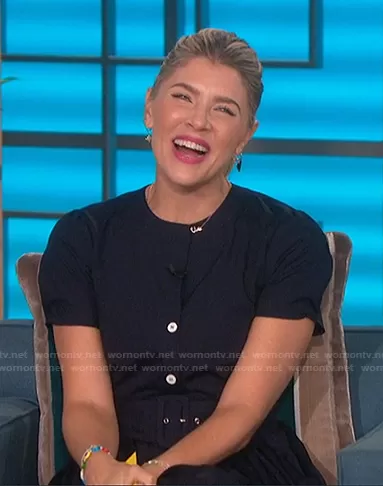 Amanda Kloots on The Talk on CBS was spotted wearing this navy belted button front dress on The Talk on Jun 09 2021's episode. Amanda's Dress is the Cotton Poplin Belted Midi Dress by Pearl by Lela Rose.