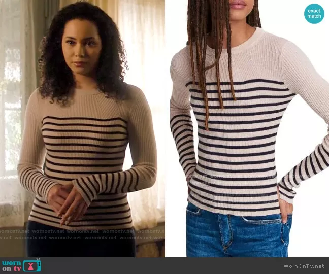 Macy Vaughn (played by Madeleine Mantock) on Charmed on The CW was spotted wearing this striped sweater on Charmed on episode 'Perfecti is the Enemy of Good' (3x14) in Jun 2021. Macy's Sweater is the Kate Sweater by Rag & Bone.