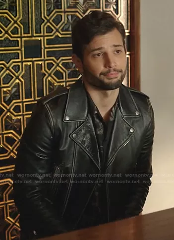 Sam Flores (played by Rafael de la Fuente) on Dynasty on The CW was spotted wearing this black distressed leather moto jacket on Dynasty on episode 'A Little Father-Daughter Chat' (4x06) in Jun 2021. Sam's Jacket is the Distressed Leather Biker Jacket by Saint Laurent.