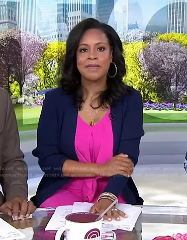 Sheinelle Jones on Today on NBC was spotted wearing this pink tie front jumpsuit on Today on Jun 14 2021's episode. Sheinelle's Jumpsuit is the Popover Jumpsuit by Slate & Willow.
