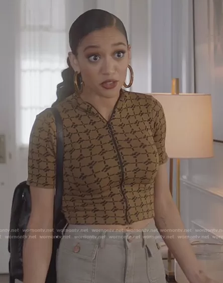 Olivia Baker (played by Samantha Logan) on All American on CWTV was spotted wearing this brown printed zip top on All American on episode 'My Mind's Playing Tricks on Me' (3x14) in Jun 2021. Olivia's Top is the Logo Print Seamless Zip-Through Funnel Neck Top Iets Frans.
