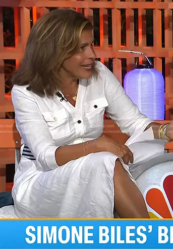 Hoda Kotb on Today on NBC was spotted wearing this white shirtdress with striped belt on Today on Aug 04 2023's episode. Hoda's Dress is the Asymmetrical Hem Midi Dress by Karl Lagerfeld.