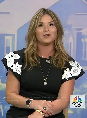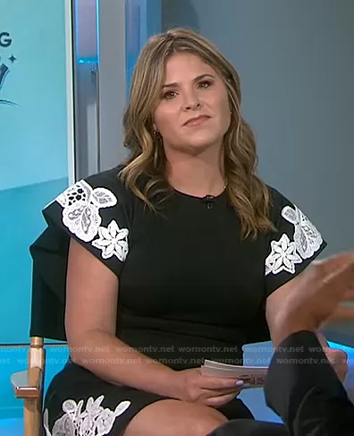 Jenna Bush Hager on Today on NBC was spotted wearing this black floral lace detail dress on Today on Sep 01 2021's episode. Jenna's Dress is the Stretch Cotton Lace Detail Dress by Pearl by Lela Rose . Jenna's Shoes is the Ophelia Floral-embroidered Leather Pump by Gucci.