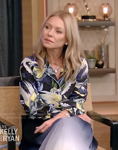 Kelly Ripa on Live with Kelly and Mark on Disney ABC Home Entertainment was spotted wearing this bird print shirt and ombre skirt on Live with Kelly and Ryan on Jun 16 2021's episode. Kelly's Top is the Fae Night Bird-print Shirt by Erdem . Kelly's Skirt is the Ombré Silk-Chiffon Midi Skirt by Burberry.