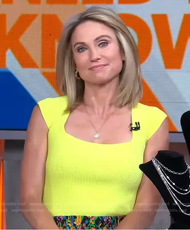Amy Robach on Good Morning America on ABC was spotted wearing this yellow ribbed top and floral mini skirt on Good Morning America on Jun 16 2021's episode. Amy's Top is the Contour Top by Helmut Lang . Amy's Skirt is the Kira Printed Smocked Skirt by Tanya Taylor . Amy's Earrings is the Emerald Rainbow Hoops by Ragen.