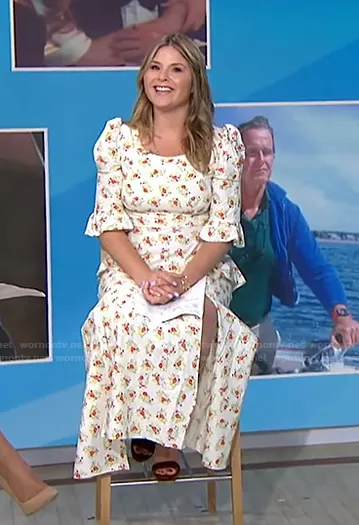 Jenna Bush Hager on Today on NBC was spotted wearing this white floral puff sleeve dress on Today on Apr 13 2023's episode. Jenna's Dress is the Quinn Dress by Rixo.