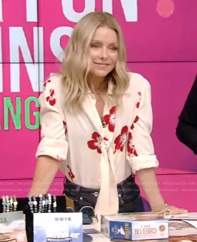 Kelly Ripa on Live with Kelly and Mark on Disney ABC Home Entertainment was spotted wearing this white floral tie neck blouse and jeans on Live with Kelly and Ryan on Jun 17 2021's episode. Kelly's Top is the Hibiscus Floral Print Shirt by Saint Laurent . Kelly's Pants is the Leather-Patch High-Rise Flared Jeans by Paco Rabanne.