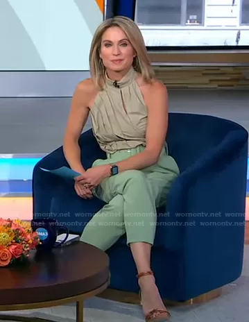Amy Robach on Good Morning America on ABC was spotted wearing this khaki halter top and green belted pants on Good Morning America on Jun 18 2021's episode. Amy's Top is the Pleated Cotton Top by Zara . Amy's Pants is the High Waisted Belted Pants by Zara . Amy's Earrings is the Emerald CZ Hoops by Accessory Concierge.