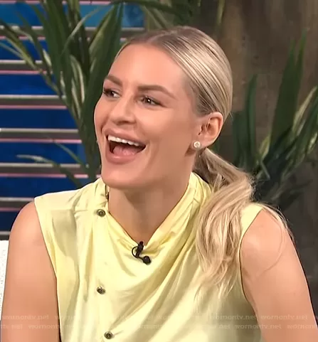 Morgan Stewart on E! News on E! was spotted wearing this yellow asymmetric button top on E! News Daily Pop on Jun 22 2021's episode. Morgan's Top is the Sleeveless Shirt by Acne Studios.