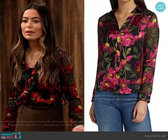 Carly Shay (played by Miranda Cosgrove) on iCarly on Paramount+ was spotted wearing this floral blouse and brown skirt on iCarly on episode 'iStart Over' (1x01) in Jun 2021. Carly's Top is the Eloise Burnout Floral Shirt by Alice + Olivia . Carly's Skirt is the Belted Wool-Blend Mini Skirt by Theory.