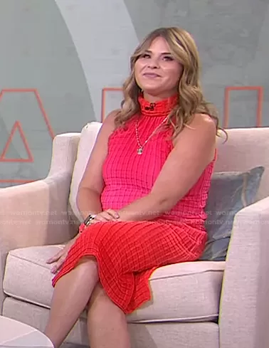 Jenna Bush Hager on Today on NBC was spotted wearing this red ombre textured dress on Today on Jun 13 2023's episode. Jenna's Dress is the Raised Plissé Chiffon Halter Midi Dress by Lela Rose.