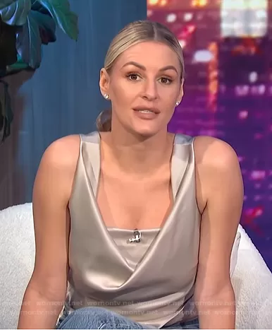 Morgan Stewart on E! News on E! was spotted wearing this cowl neck satin top on E! News Nightly Pop on Jun 23 2021's episode. Morgan's Top is the Petra Top by Nanushka.