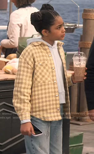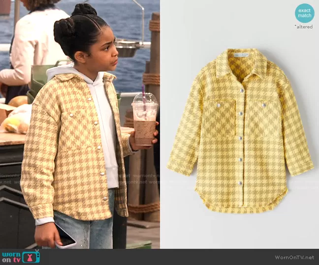 Millicent (played by Jaidyn Triplett) on iCarly on Paramount+ was spotted wearing this yellow houndstooth jacket on iCarly on episode 'iHate Carly' (1x02) in Jun 2021. Millicent's Jacket is the Fringed Houndstooth Overshirt by Zara .