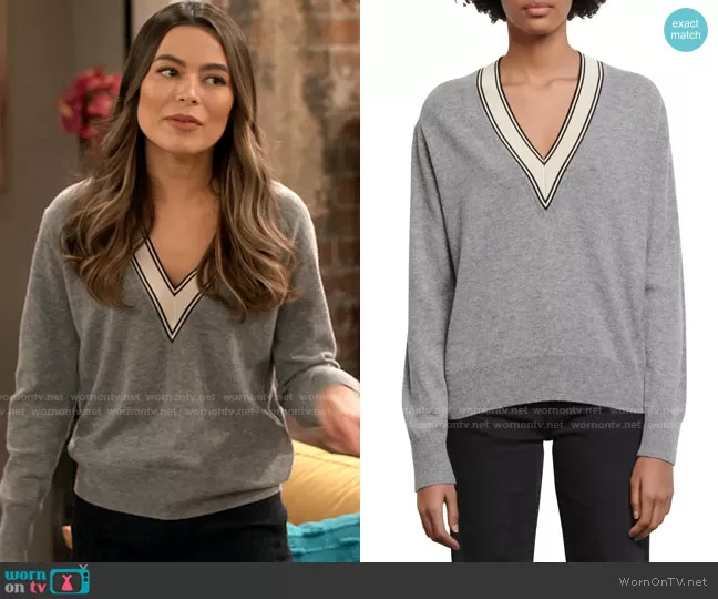 Carly Shay (played by Miranda Cosgrove) on iCarly on Paramount+ was spotted wearing this grey striped trim v-neck sweater on iCarly on episode 'iHate Carly' (1x02) in Jun 2021. Carly's Sweater is the Camie Sweater by Sandro.