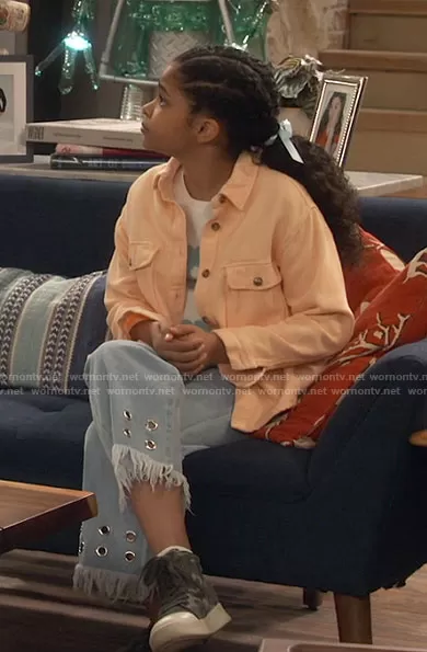 Millicent (played by Jaidyn Triplett) on iCarly on Paramount+ was spotted wearing this floral sweater and frayed jeans on iCarly on episode 'iFauxpologize' (1x03) in Jun 2021. Millicent's Sweater is the Girls Floral Sweater-Knit Top by Forever 21 . Millicent's Jeans is the Girls Frayed Grommet Jeans by Forever 21.