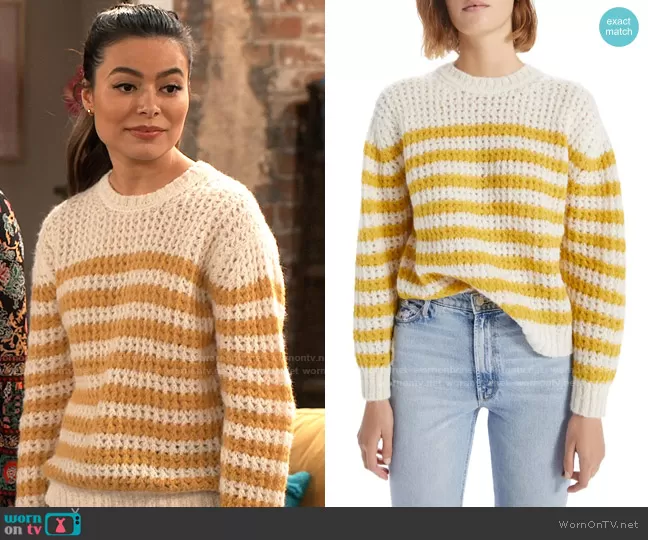 Carly Shay (played by Miranda Cosgrove) on iCarly on Paramount+ was spotted wearing this yellow striped sweater on iCarly on episode 'iFauxpologize' (1x03) in Jun 2021. Carly's Sweater is the The Jumper Stripe Alpaca Blend Sweater in Mostly Sunny by Mother.