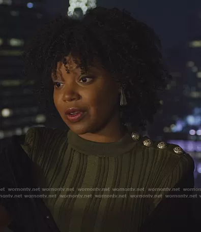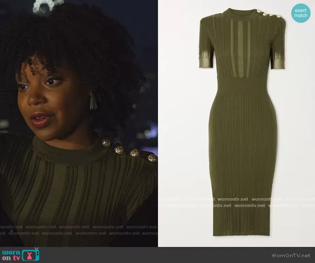 (played by ) on The Good Fight on CBS was spotted wearing this green button shoulder dress on The Good Fight on episode 'Previously On...' (5x01) in Jun 2021. 's Dress is the Button-embellished metallic ribbed silk, wool and cashmere-blend midi dress by Balmain.